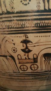 A detail of a big Vase, showing a warrior on a chariot, wearing his 8-shape shied as an armor. It is easy to distinguish that his head looks like an ant’s one. This is a Mirmidon, member of the legendary army that was under the command of Achilles, during the Trojan War. The word «Mirmidon» is originating from the word «mirmix», the ant in ancient Greek. According to the tradition Mirmidons were actually transformed ants. A more rational explanation about the name is that like ants, they were both fearsome and merciless.